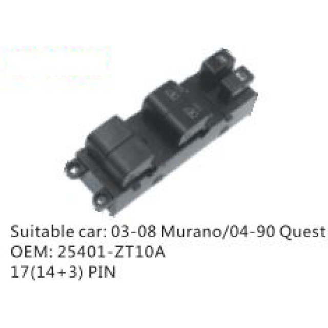 OEM: 25401-ZT10AVEHICLE MODEL: 03-08 Murano/04-90 QuestITEM: Window Regulator SwitchPIN QUANTITY: 17(14 +3) PINPRODUCT NUMBER: PC-0100193
