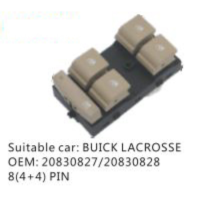 OEM: 20830827/20830828VEHICLE MODEL: BUICK LACROSSEITEM: Window Regulator SwitchPIN QUANTITY: 8(4+4) PINPRODUCT NUMBER: PC-0100235