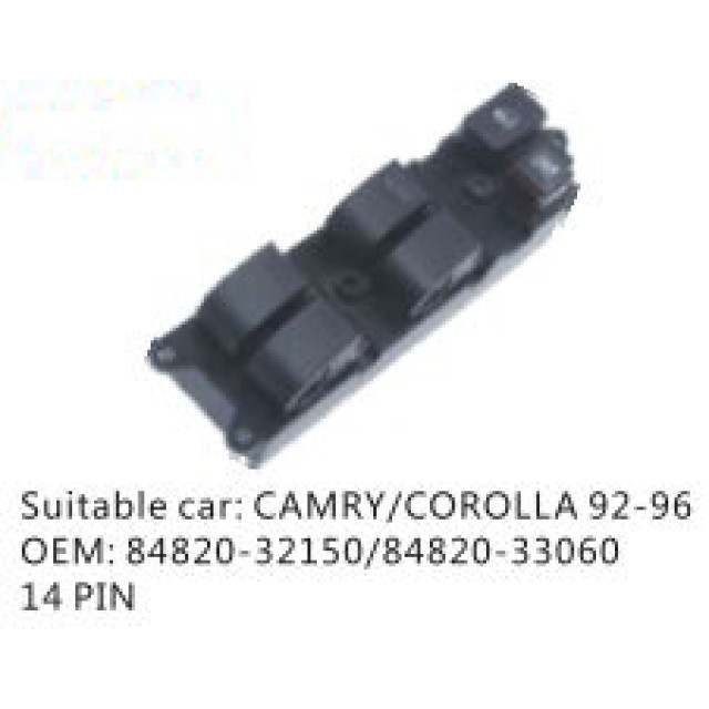 OEM: 84820-32150/84820-33060VEHICLE MODEL: CAMRY/COROLLA 92-96ITEM: Window Regulator SwitchPIN QUANTITY: 14 PINPRODUCT NUMBER: PC-0100147