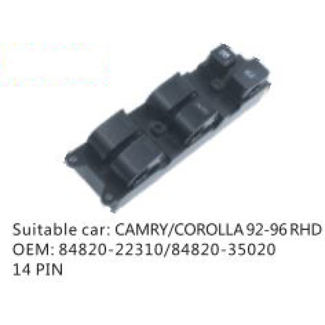 OEM: 84820-22310/84820-35020VEHICLE MODEL: CAMRY/COROLLA92-96 RHDITEM: Window Regulator SwitchPIN QUANTITY: 14 PINPRODUCT NUMBER: PC-0100148