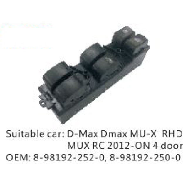 OEM: 8-98192-252-0, 8-98192-250-0VEHICLE MODEL: D-Max Dmax MU-X RHD MUX RC 2012-ON 4 doorITEM: Window Regulator SwitchPRODUCT NUMBER: PC-0100460