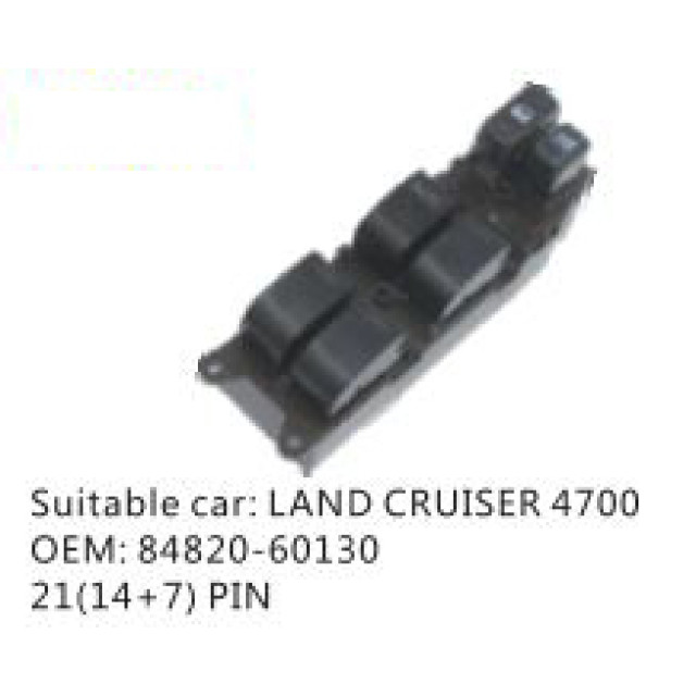 OEM: 84820-60130VEHICLE MODEL: LAND CRUISER 4700ITEM: Window Regulator SwitchPIN QUANTITY: 21(14+ 7) PINPRODUCT NUMBER: PC-0100156
