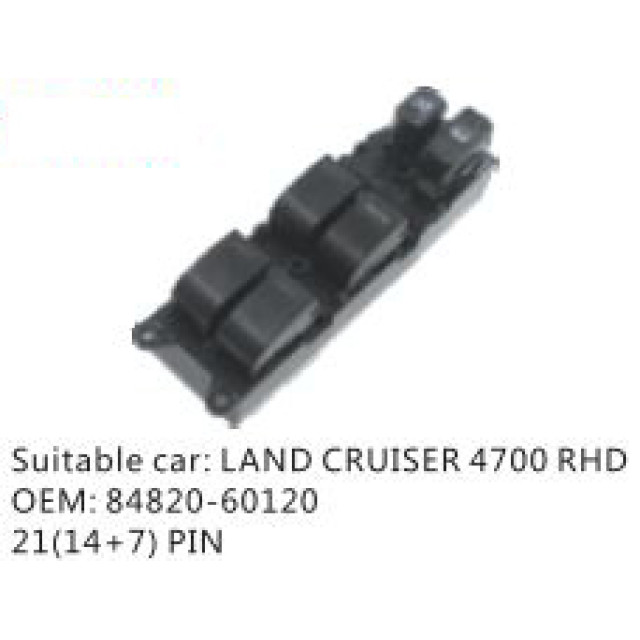 OEM: 84820-60120VEHICLE MODEL: LAND CRUISER 4700 RHDITEM: Window Regulator SwitchPIN QUANTITY: 21(14+7) PINPRODUCT NUMBER: PC-0100157