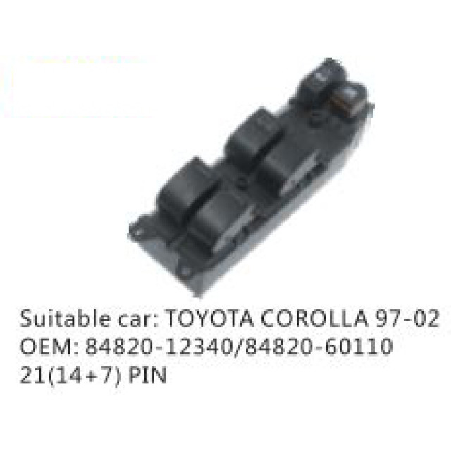 OEM: 84820-12340/84820- 60110VEHICLE MODEL: TOYOTA COROLLA 97-02ITEM: Window Regulator SwitchPIN QUANTITY: 21(14+ 7) PINPRODUCT NUMBER: PC-0100162