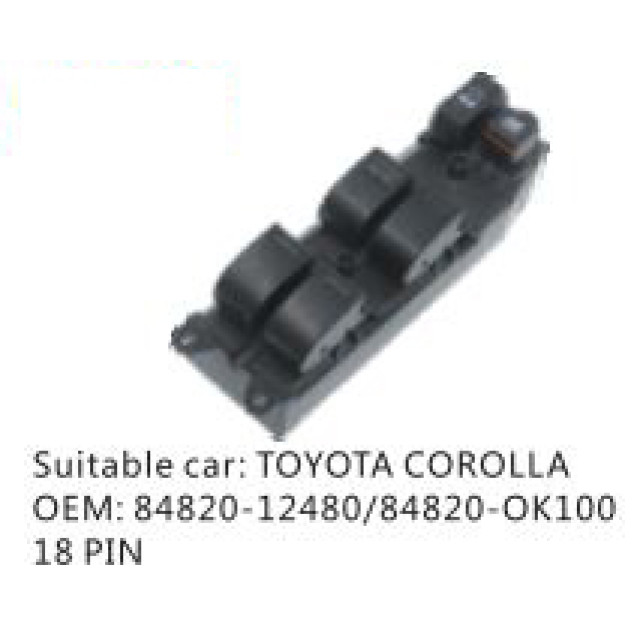 OEM: 84820- 12480/84820-OK100VEHICLE MODEL: TOYOTA COROLLAITEM: Window Regulator SwitchPIN QUANTITY: 18PINPRODUCT NUMBER: PC-0100160