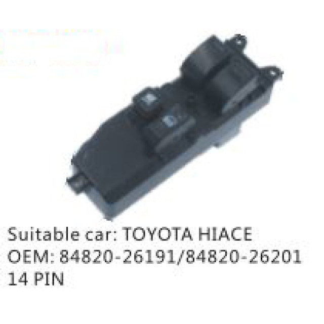 OEM: 84820-26191/84820-26201VEHICLE MODEL: TOYOTA HIACEITEM: Window Regulator SwitchPIN QUANTITY: 14 PINPRODUCT NUMBER: PC-0100171